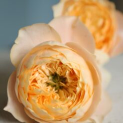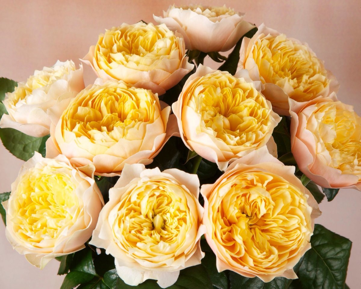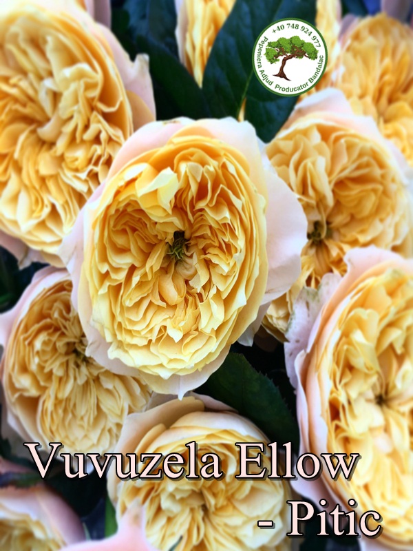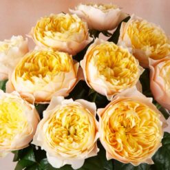 Florile sunt aurii-crem cu petale exterioare ușoare, muguri sferici mari, dens,